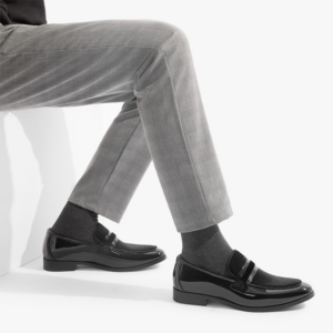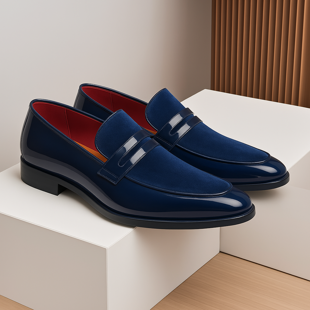 These sleek dress loafers combine glossy patent leather with rich velvet for a modern take on classic formal footwear. The contrasting textures create a striking look while the low-profile design makes it perfect for special events.
