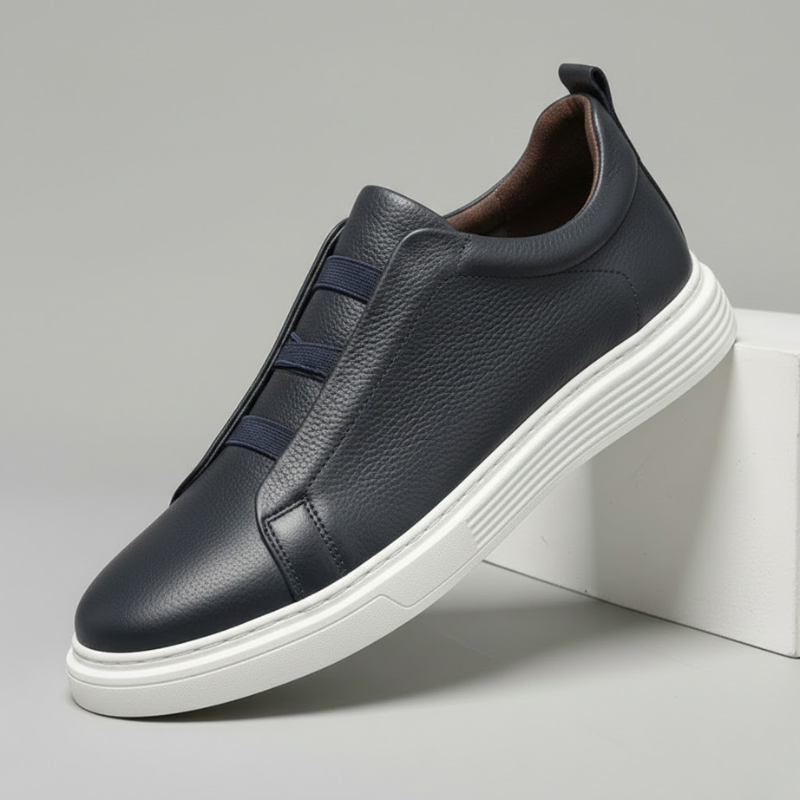 A maverick take on a classic sneaker features a smooth, genuine Italian leather upper with subtle stitching details and signature loop lacing for a refined look.