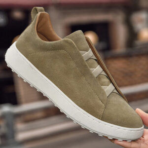 A modern take on a classic sneaker features a smooth, premium suede upper with subtle stitching details and signature loop lacing for a refined look.