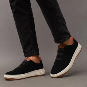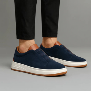 A modern take on a classic sneaker features a smooth, premium suede upper with subtle stitching details and signature loop lacing for a refined look.
