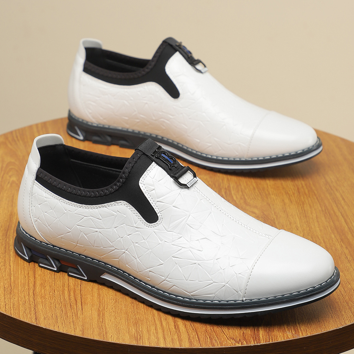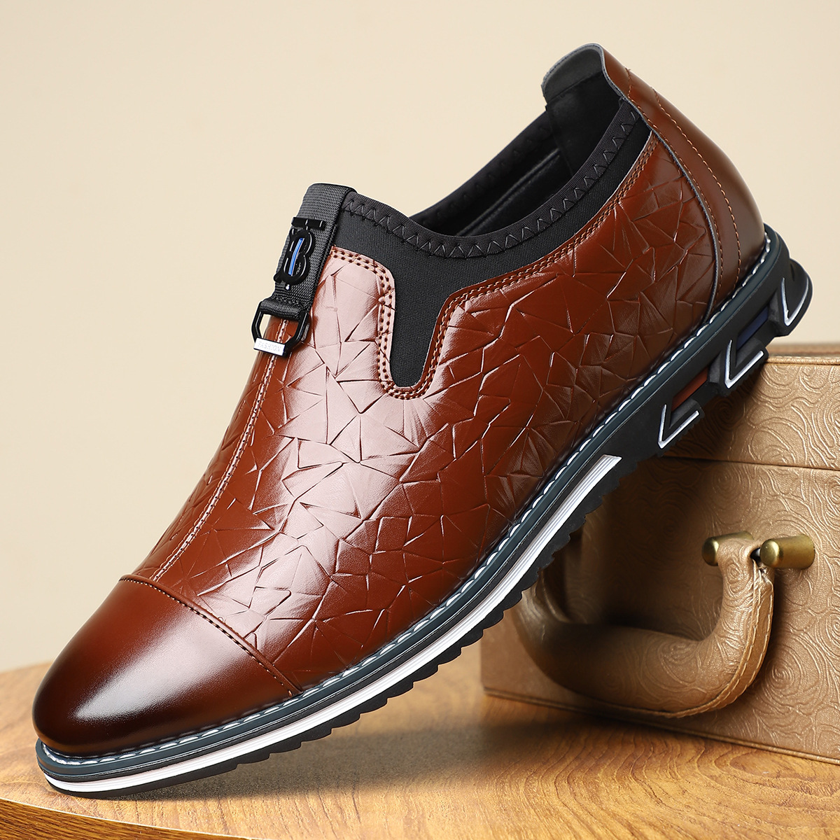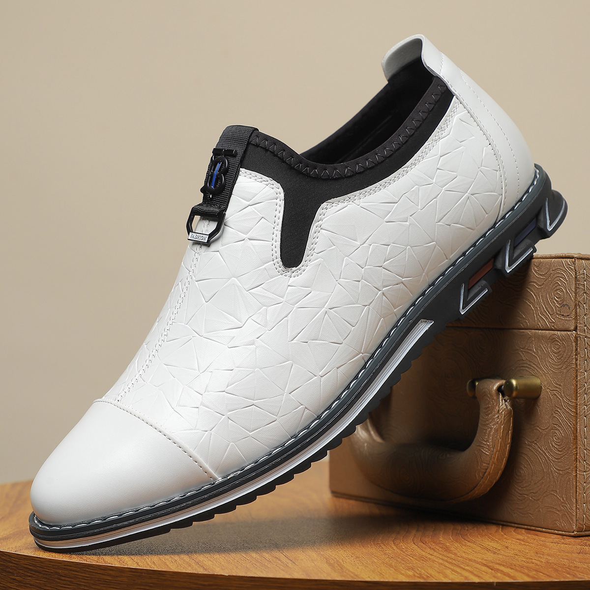 - Embossed leather upper