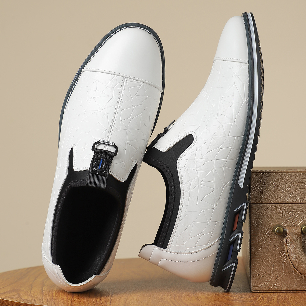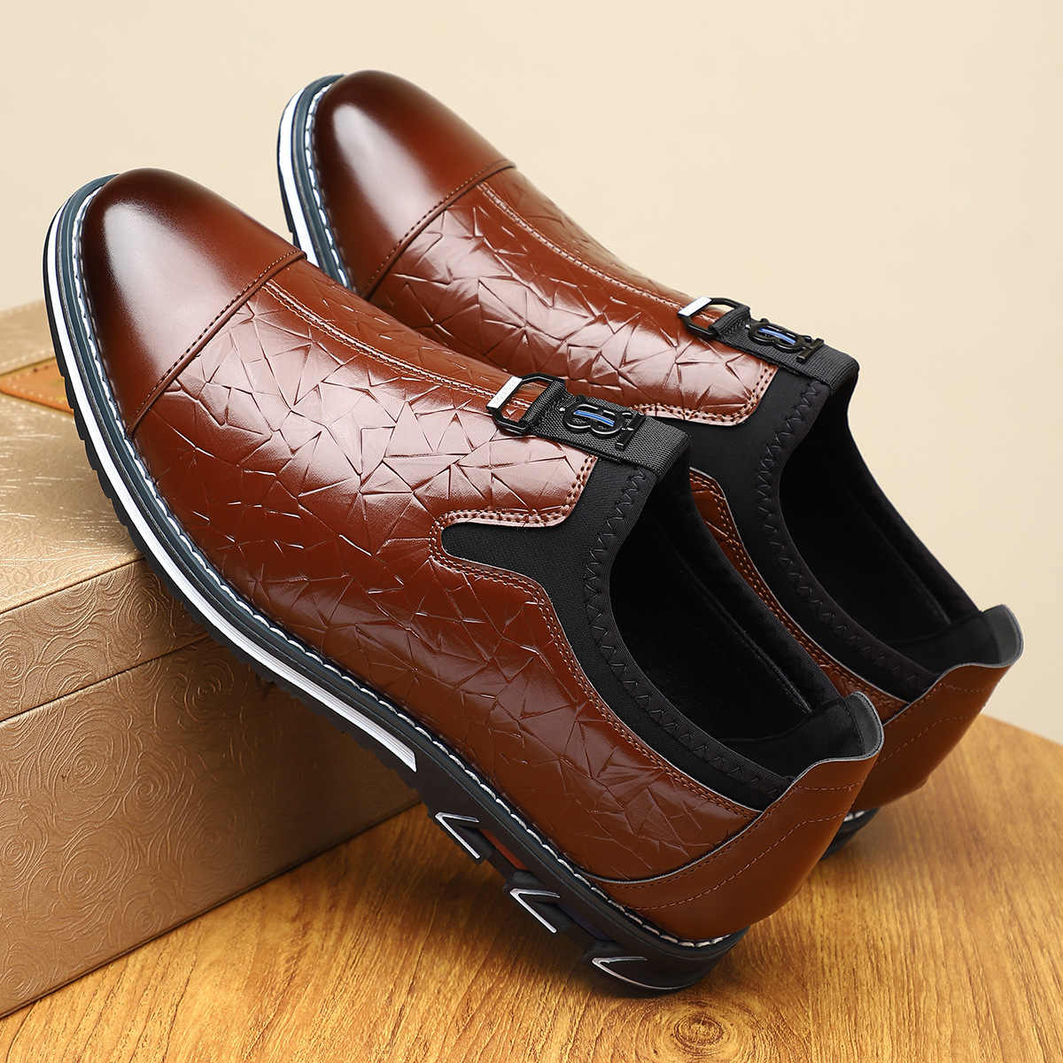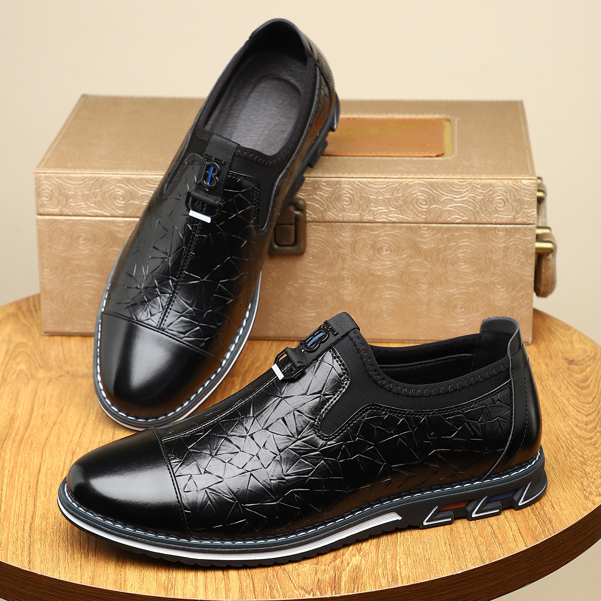 - Embossed leather upper