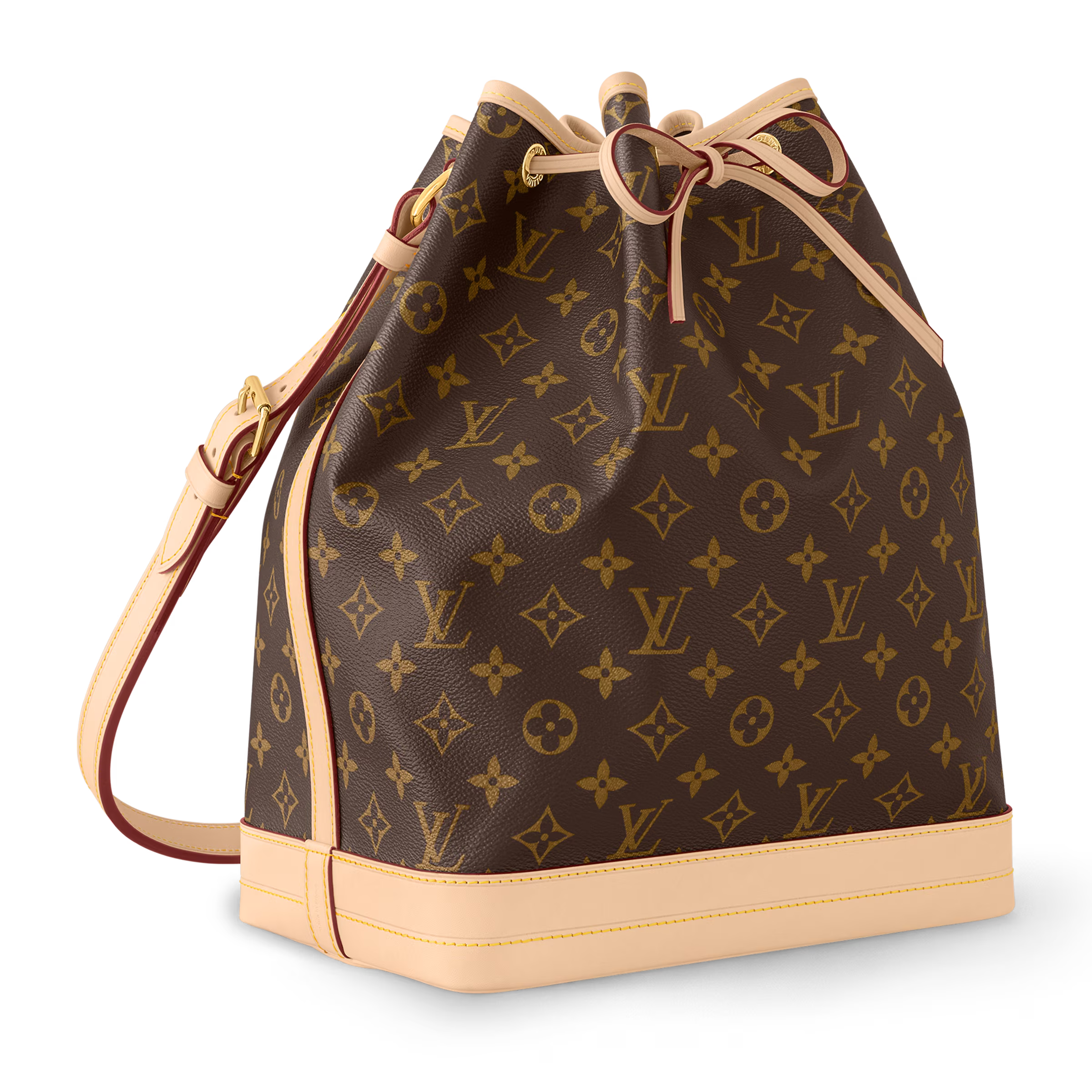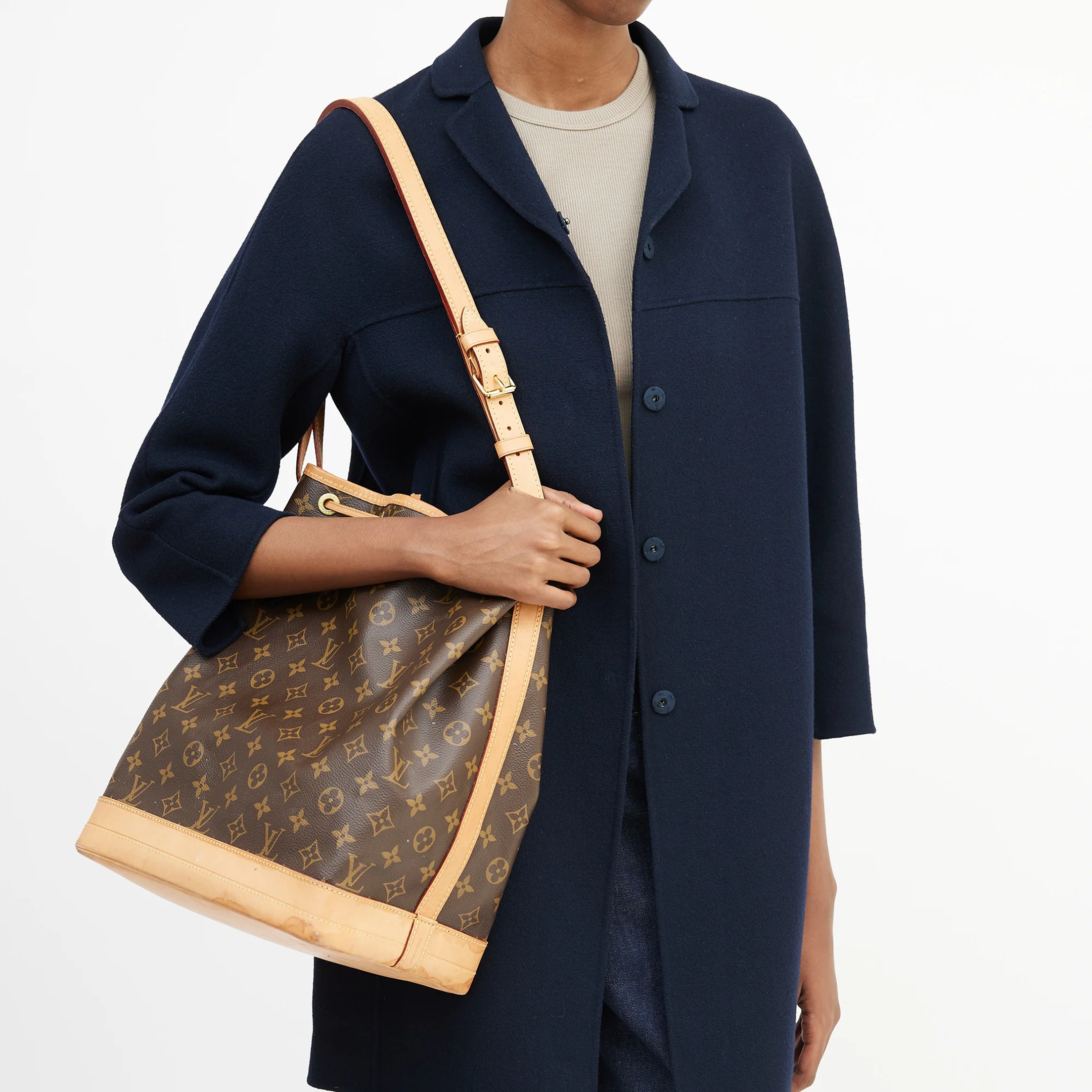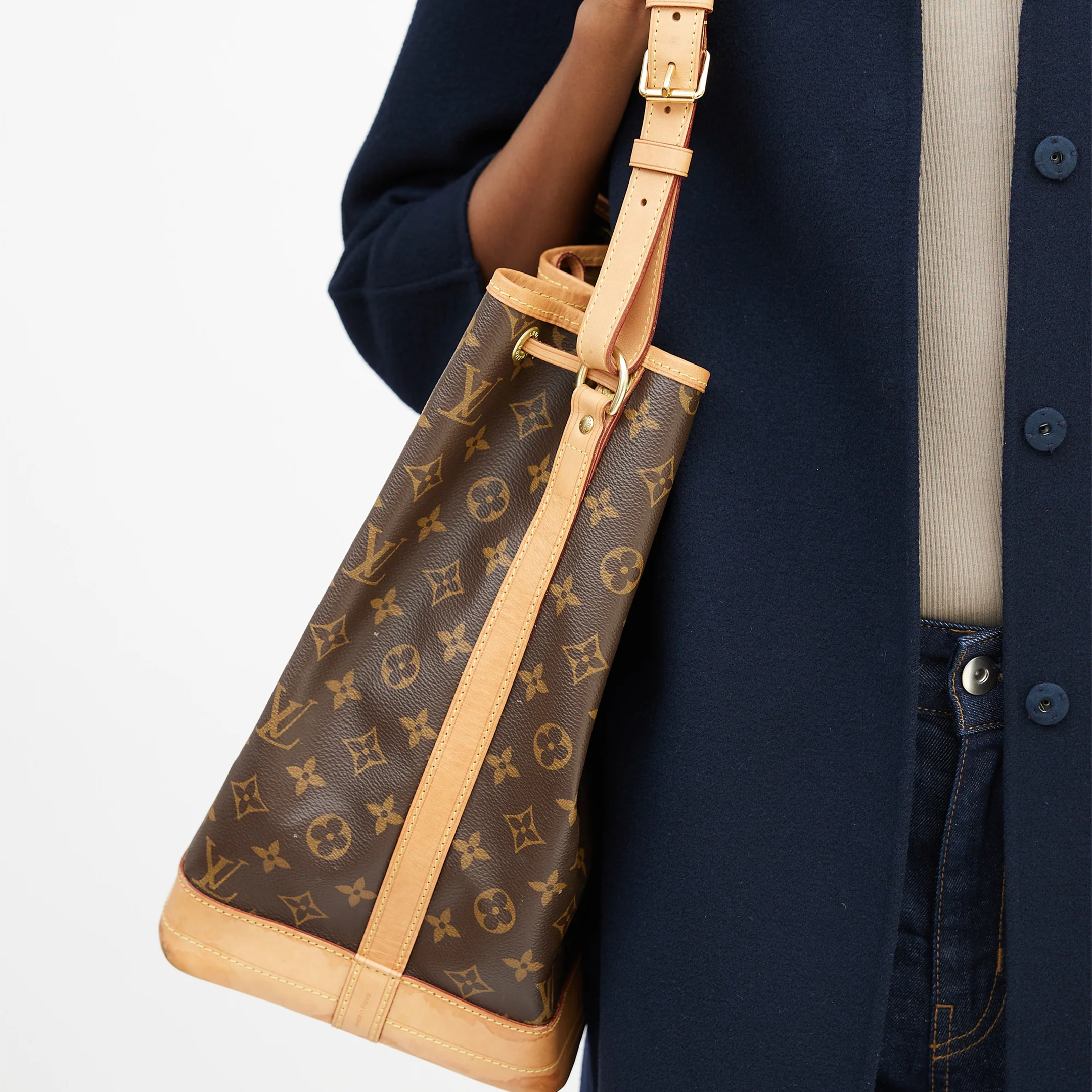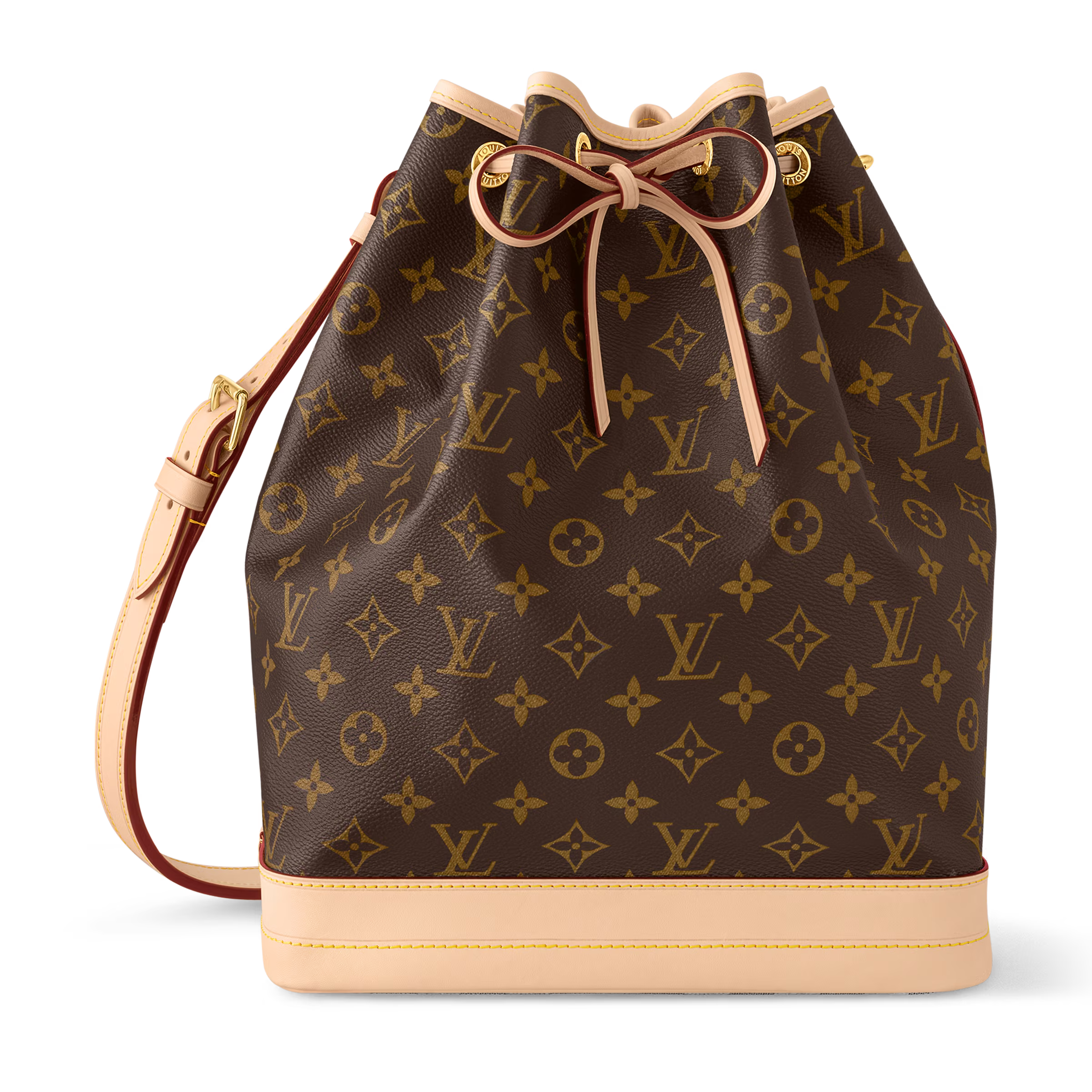 The Noé bucket bag harks back to a design from 1932. A Champagne producer asked Gaston-Louis Vuitton to develop a sturdy, stylish bag in which he could transport five bottles of bubbly. This model in body-friendly Monogram canvas retains key features of the original – the iconic shape, generous volume, drawstring closure – but is made for modern life. The leather strap adjusts for comfortable shoulder wear.