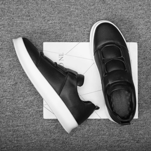 A modern take on a classic sneaker features a smooth, premium leather upper with subtle stitching details and signature loop lacing for a refined look.