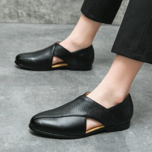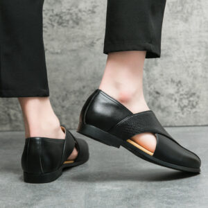Crafted from genuine leather, these loafers showcase a sleek, minimalist design accented by distinctive cross-straps on the vamp featuring a finely textured weave, adding a refined touch. Equipped with a supportive sole, they ensure a comfortable fit for all-day wear.