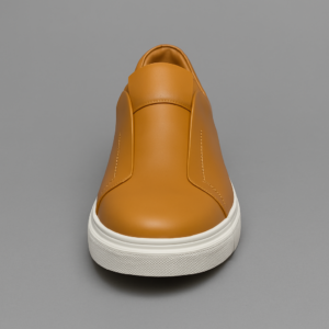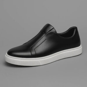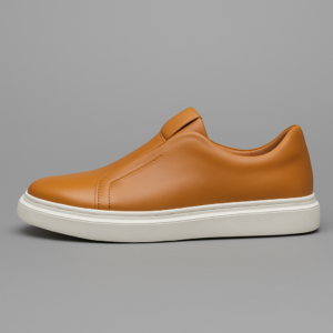 A modern take on a classic sneaker features a smooth, premium leather upper with subtle stitching details and signature no-lace design for a refined look.